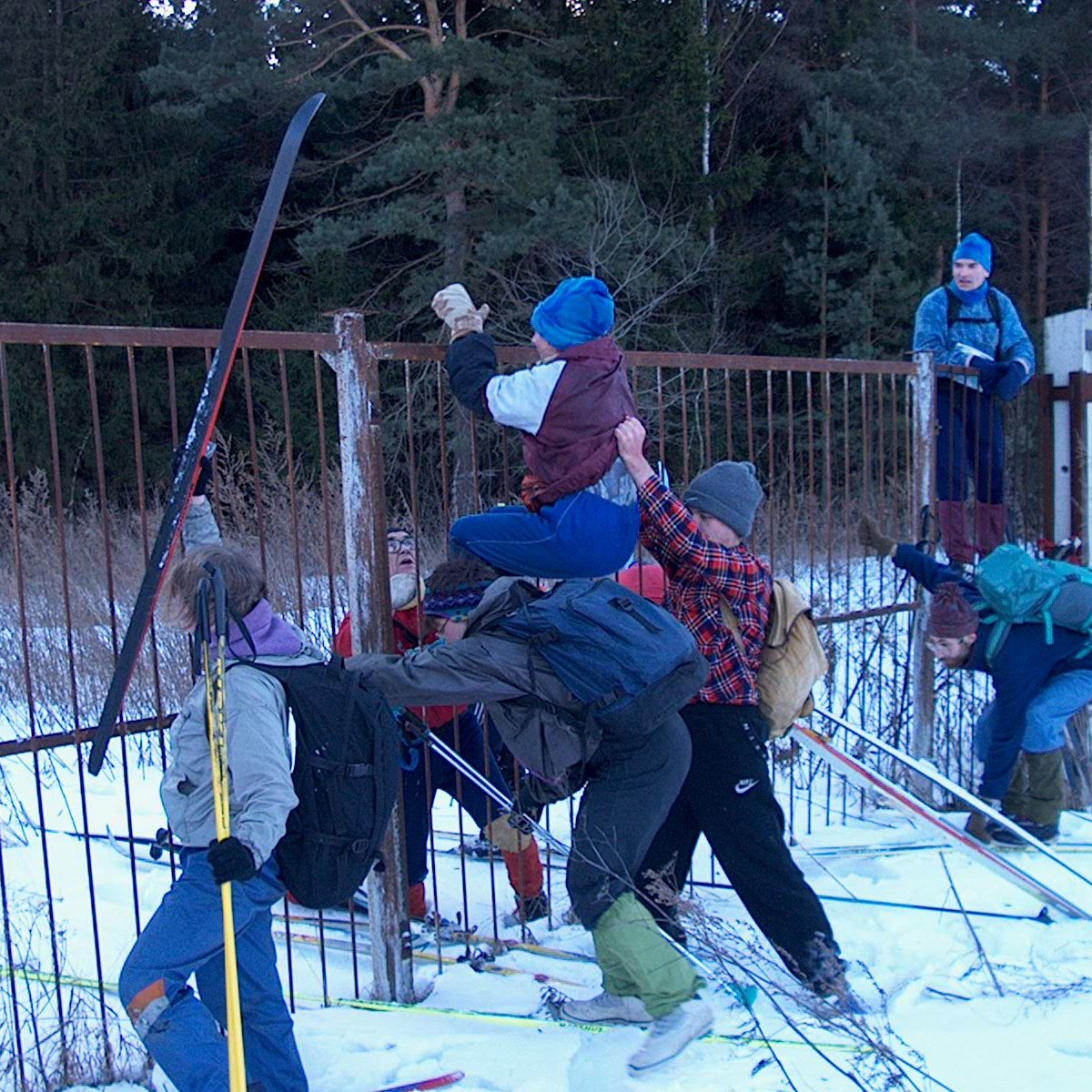 Перелезание забора, Настовый поход из Шараповой Охоты, Подмосковье: 26 января 2002